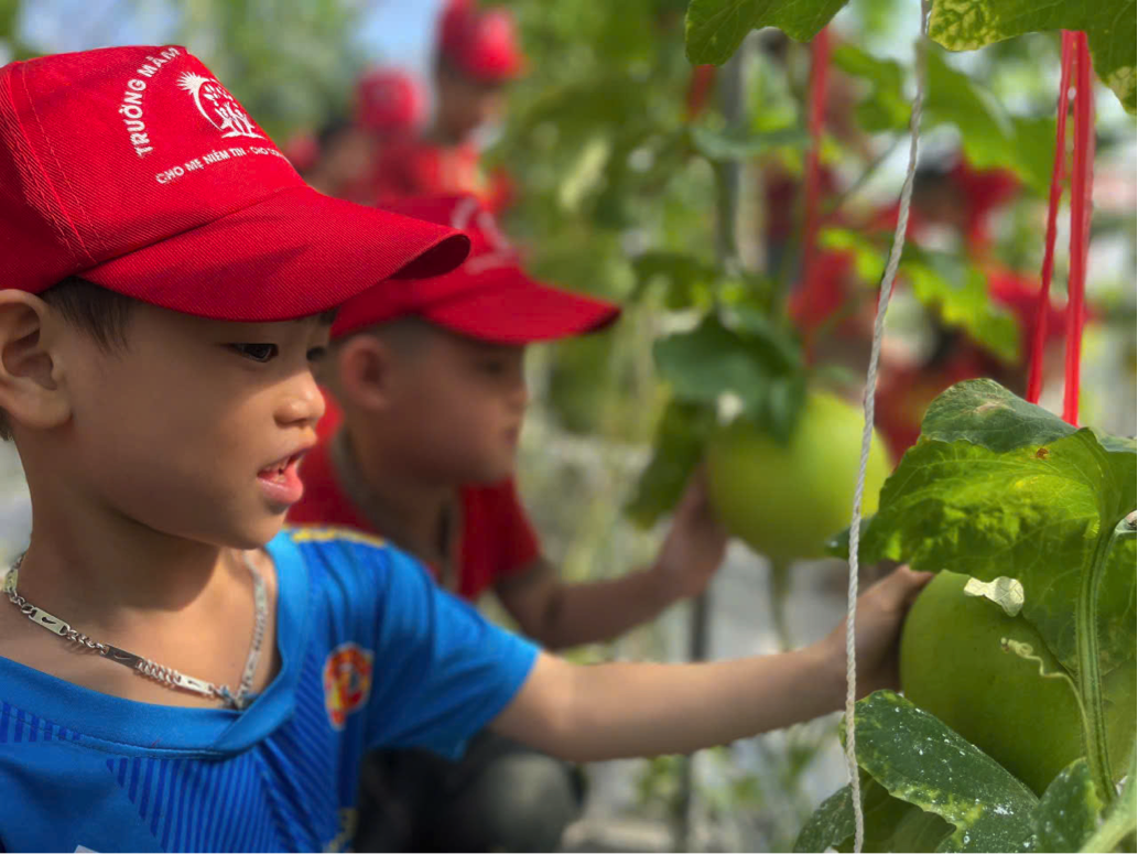 Các em say sưa ngắm nghía, vuốt ve từng luống rau cải mướt xanh, rau xà lách, dưa chuột, dưa lưới... hít hà mùi vị tự nhiên ở mỗi luống rau hẹ, rau mùi, hoa đồng tiền...
